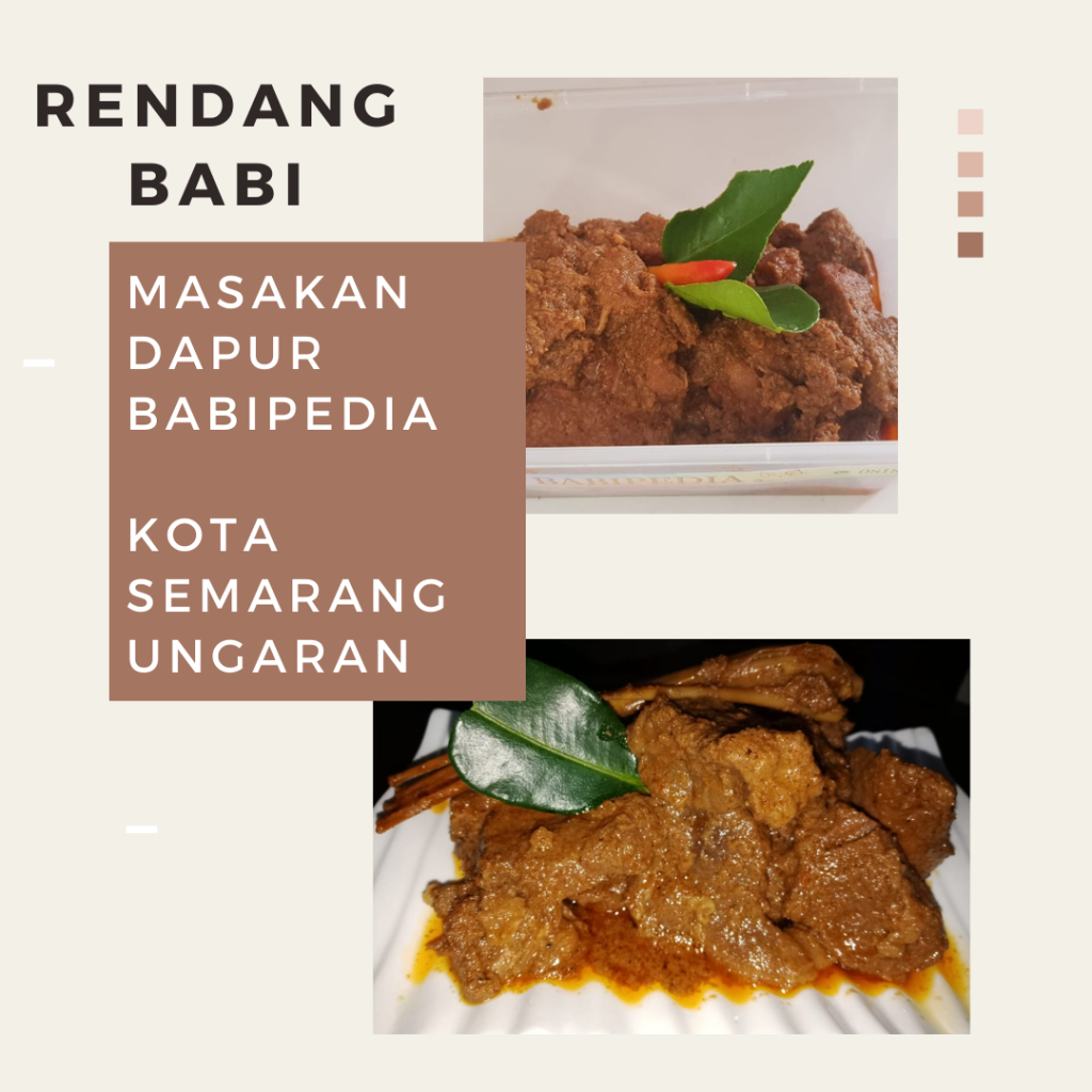 Biasanya Rendang terbuat dari daging sapi tetapi kali ini di Dapur Glory Pork Babipedia berbeda, Rendang terbuat dari daging babi.Untuk mencari Rendang babi sendiri kalau di Indonesia cukup sulit, Dapur Glory Pork Babipedia adalah satu-satunya pedagang yang menjual masakan rendang babi terpercaya di Semarang Ungaran. Menggunakan daging pilihan lalu di masak bersama bumbu-bumbu khas rendang beberapa jam sehingga membuat bumbu merasuk dengan sempurna ke dalam daging dan memberikan rasa gurih serta sedikit pedas yang membuat semua rasa mengeliat di lidah.